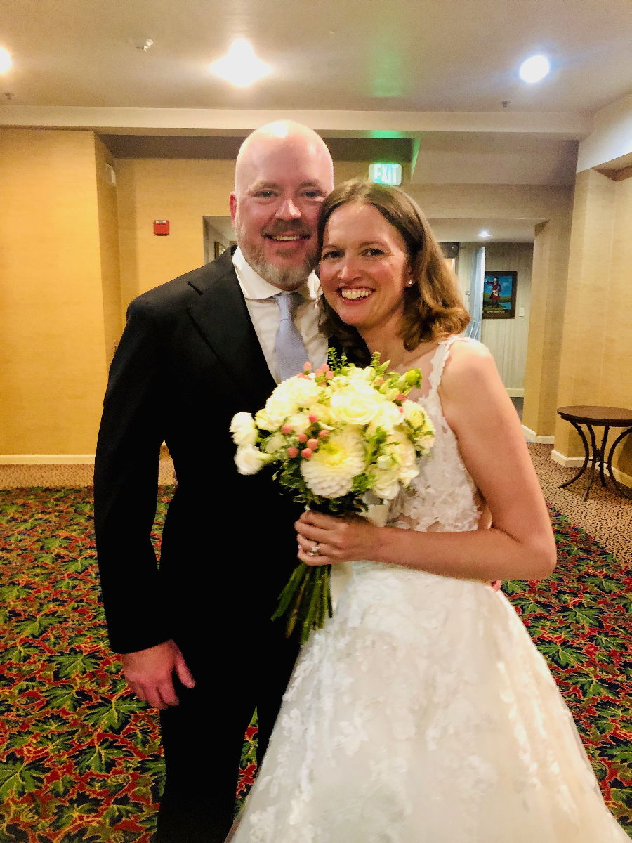 The wedding was a beautiful affair, rather like our own wedding in 1978 in its small size and simplicity. Sara looked like a fairy princess in her gorgeous lace gown. Doug was very handsome in his dark suit. Although scheduled for the gazebo in town at 4PM, it was the only Saturday in a month that it rained. However, the celebration was moved inside and the 40 guests fit easily into the lobby of the Wolfeboro Inn.